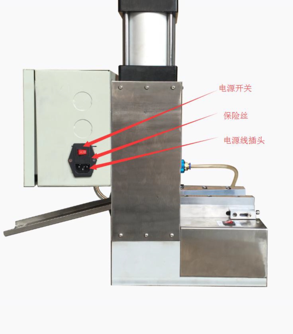 5-1.测试; 接通电源,打开开关,让设备通电,通电后电源指示绿色灯常亮,红灯闪烁。(如图)拨到手动模式状态,按下启动按钮,整形机进行整形工作,让设备空转运行(3-5次)观察设备是否正常运行,有无异常; 然后拨到自动状态,按下启动按钮,输送皮带启动,先放入若干产品进行测试,(3-5次)观察设备是否正常运行,有无异常; 如有异常,请联系我公司工作技术人员,非专业人事请勿拆机;否者不予保修;